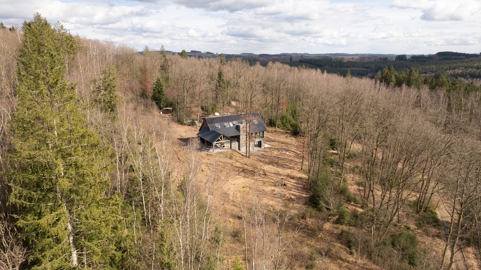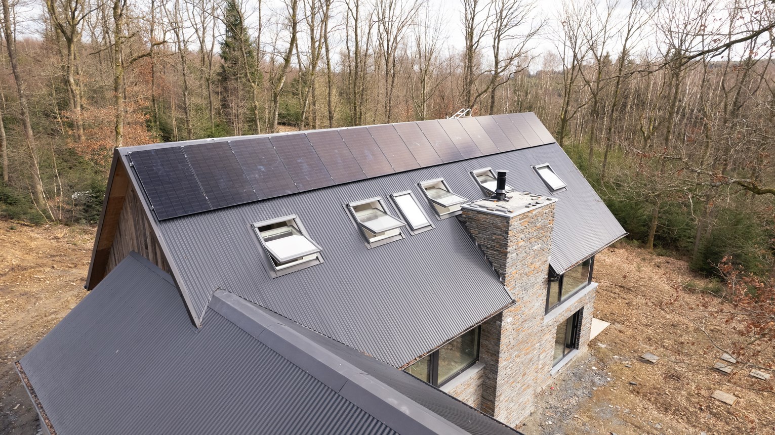 Le défi pour cette résidence située au beau milieu d'une forêt ardennaise ? Trouver une solution off-grid fiable qui puisse être combinée avec tout le confort moderne. L'off-grid alimente d'ailleurs une pompe à chaleur géothermique.